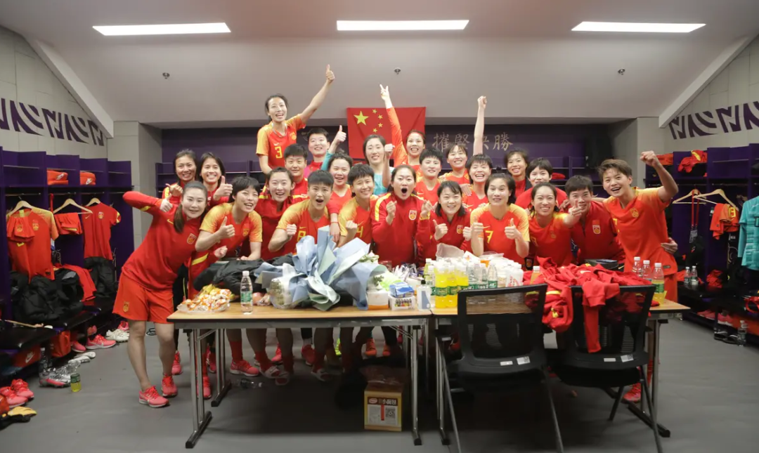 战胜韩国队后女足姑娘们合影庆祝