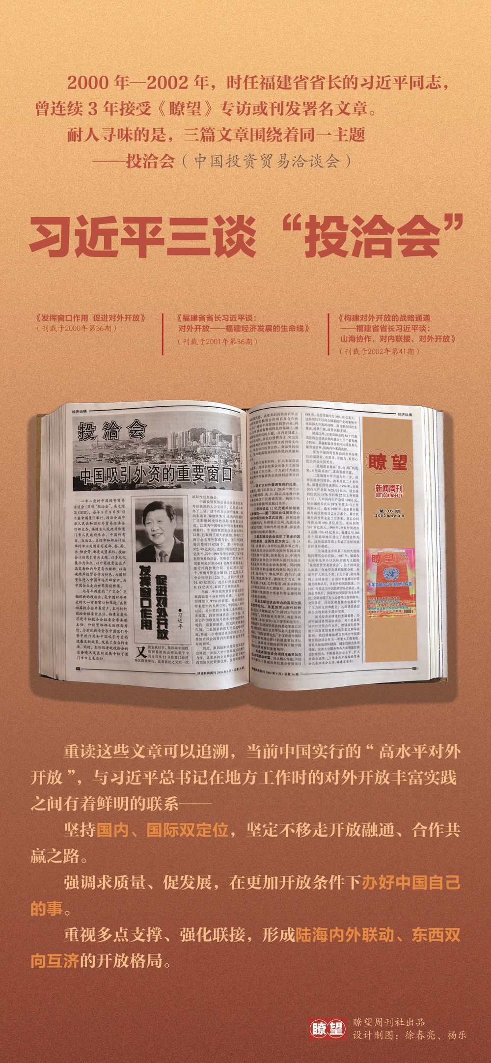 2002年10月14日,《瞭望》刊发专访报道《构建对外开放的战略通道——福建省省长习近平谈:山海协作,对内联接,对外开放》。文中,习近平由第六届投洽会成果,谈及福建进一步扩大对外开放的具体思路——着力构建山海协作、对内联接、对外开放三条战略通道。