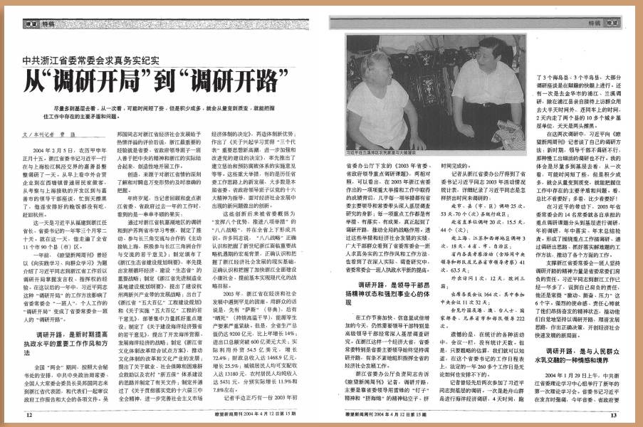 时任新华社浙江分社社长的费强,曾多次随习近平参加基层调研。2003年3月17日第11期、2004年4月12日第15期《瞭望》先后刊发了费强采写的深度报道《向实践学习 向群众学习——浙江省委书记习近平调研纪实》《从“调研开局”到“调研开路”——中共浙江省委常委会求真务实纪实》。文章记录了习近平同志任浙江省委书记期间,以特色鲜明的基层调研迅速打开工作局面的生动过程。