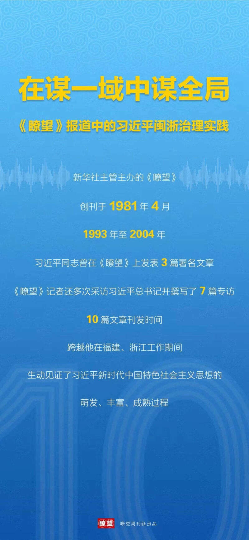 新华社主管主办、创刊于1981年4月的《瞭望》,从1993年至2004年,曾先后10次专访习近平同志或刊发他的署名文章,时间跨越他在福建、浙江工作期间,生动见证了习近平新时代中国特色社会主义思想的萌发、丰富、成熟过程。