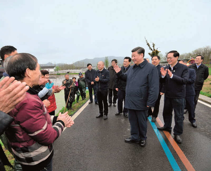 2020年3月29日至4月1日,中共中央总书记、国家主席、中央军委主席习近平在浙江考察。这是3月30日,习近平在湖州市安吉县天荒坪镇余村考察调研,同正在清理荷塘的村民亲切交流,询问春耕备耕情况 申宏摄 / 本刊