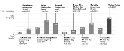 研究表明,2016年美国的基尼系数是0.81,公元79年庞贝古城(现在的意大利)的基尼系数是0.54,而公元前1930年拉罕(现在的埃及)的这一数字则是0.68,可见贫富差距从古至今都是困扰人类社会的关键问题。研究人员认为,社会的技术水平越高,就越不平等,这也是对未来人类走向高科技的警示。