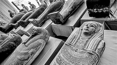 墓葬中,密封的木棺被堆叠在一起,旁边有40尊重生之神“普塔-索卡尔-奥西里斯”的雕像,还有一座莲花神涅斐尔图姆的青铜雕像。此外,考古学家还发现了20个木箱,上面刻有埃及的空中之神荷鲁斯的形象。