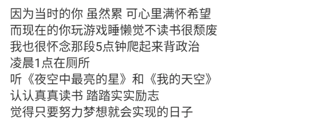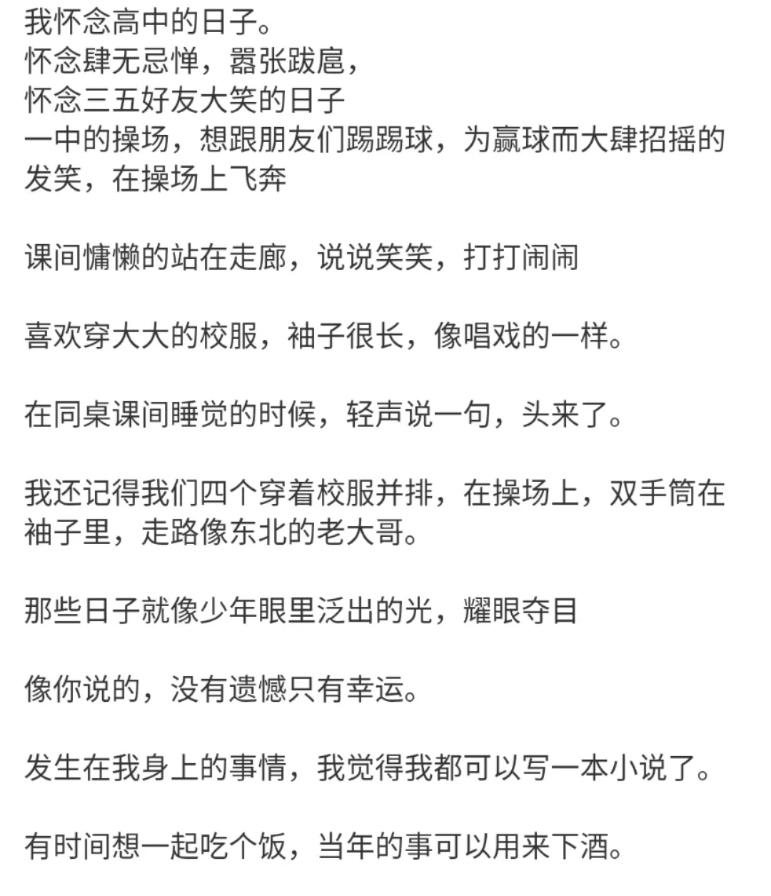一件件无聊但生动的小事串联起来,组成了周而复始的高中时光。那些听起来好像枯燥无聊、一天天重复的日夜在现在看来却是如此怀念。