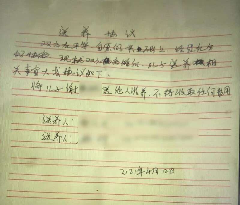 经人介绍下,黄某得知了谢某想要“卖孩子”,于是双方一拍即可,商讨着交易孩子的相关细节。在一番讨价还价后,最终黄某以15万8千元的价格买下谢某的孩子佳佳,并当场签署了买卖协议,“送养方和孩子不再来往......”白纸黑字将孩子当成了筹码进行了买卖,分两次将款项以现金的形式交易给了谢某。