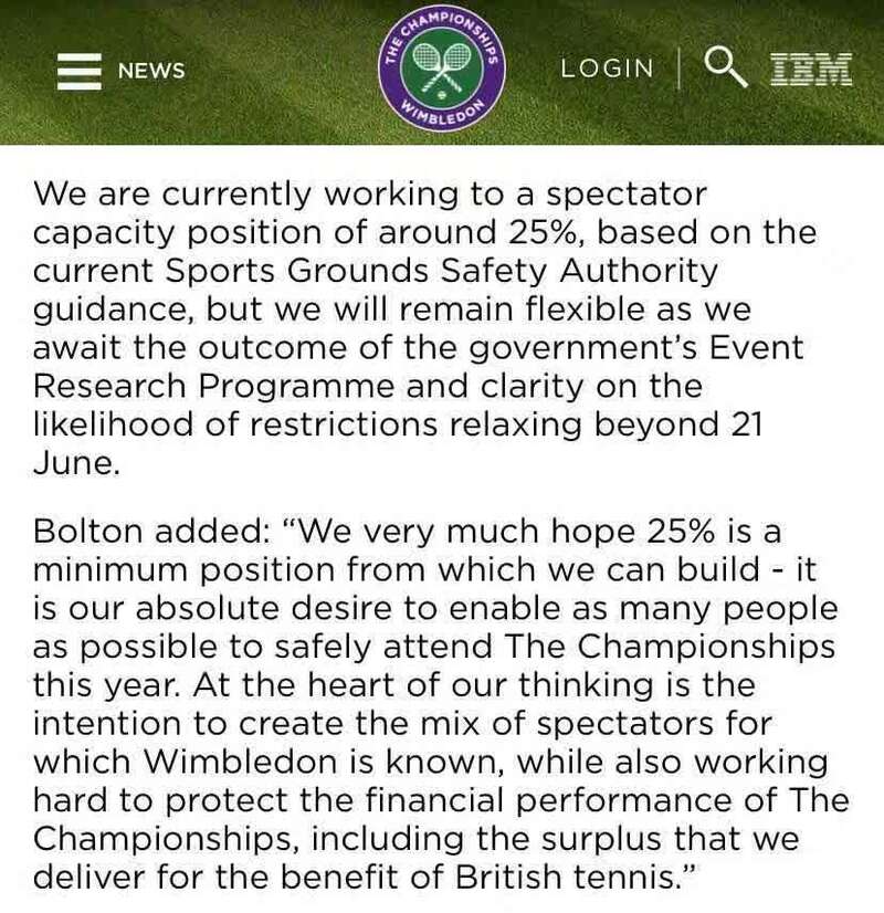 博尔顿表示,他们非常希望25%的上座率是个“保底数字”,然后他们在此基础上,在保证安全的情况下,能够迎接更多观众入场。除了强调观众是温网重要的组成部分,博尔顿坦言他们也在竭尽全力保证赛事的经济效益,因为这项赛事的大部分盈利都会用于资助英国网球。