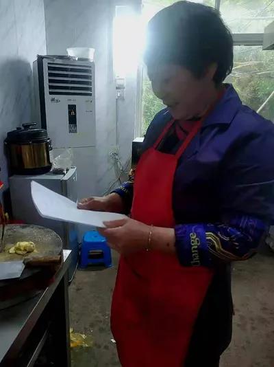 韩仕梅在厨房看自己写的诗。受访者供图