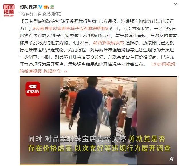 日前,一段“导游怒怼游客称孩子没死就得进去购物”的视频在网上热传。据报道,此事出现在知名旅游地西双版纳。当时,游客齐某被安排位于景洪工业园区的品翠轩珠宝店购物,进店时正好接到家人的视频电话,被告知“儿子生病要做手术”。