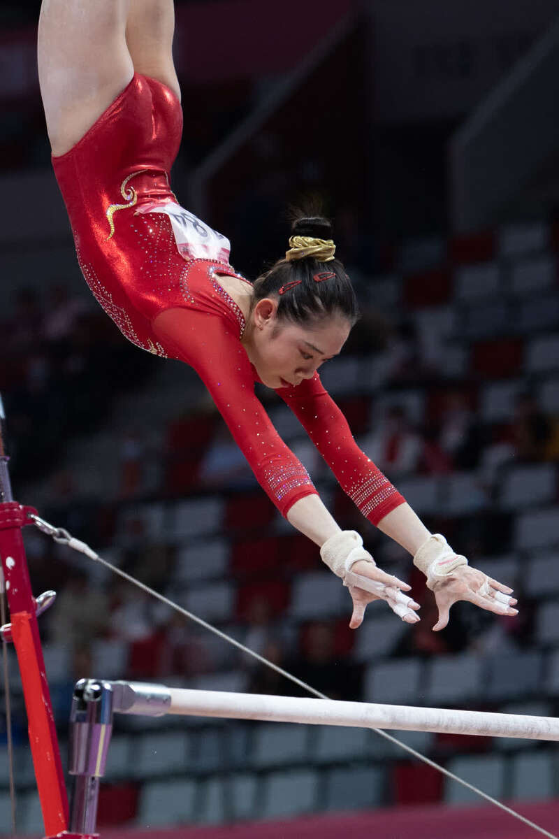 5月5日,广东队刘婷婷在高低杠比赛中。新华社记者胥冰洁摄