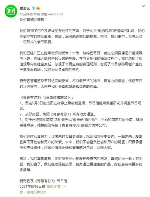 5月6日深夜,@爱奇艺 发布声明,就“倒奶事件”致歉,并表示从即刻起关闭《青春有你3》所有助力通道。