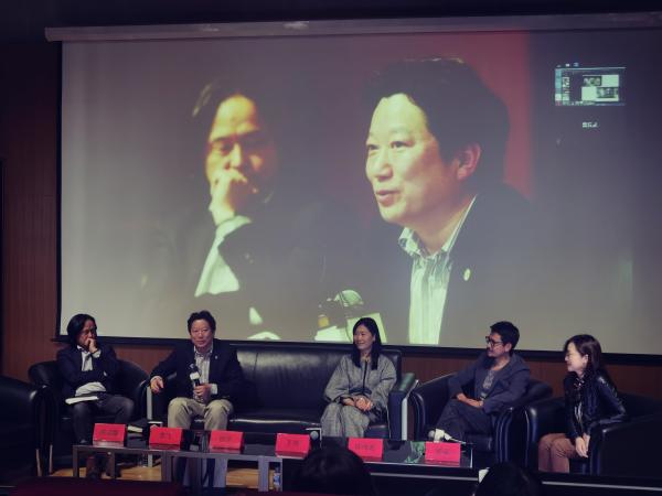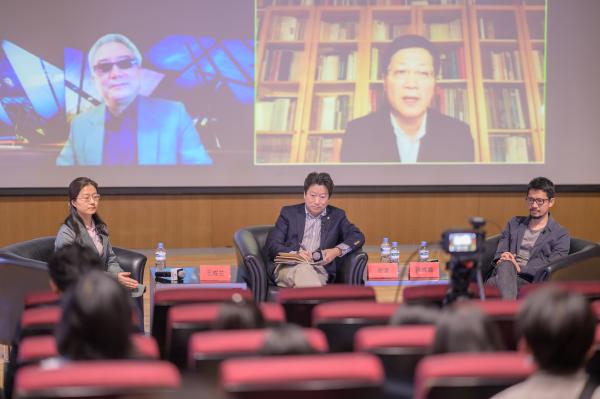 明尼阿波利斯艺术博物馆亚洲艺术部门主任柳杨教授(视频连线右)、加拿大皇家安大略博物馆沈辰教授(视频连线左)、上海历史博物馆研究员王成兰(左)、上海大学历史系主任徐坚教授(中)、艺术家陈彧君(右)