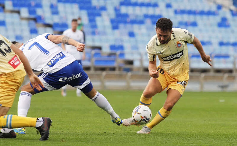5月8日,西班牙人队球员大卫·洛佩兹(右)与萨拉戈萨队球员纳瓦埃斯在比赛中拼抢。新华社发(西乙联赛供图)