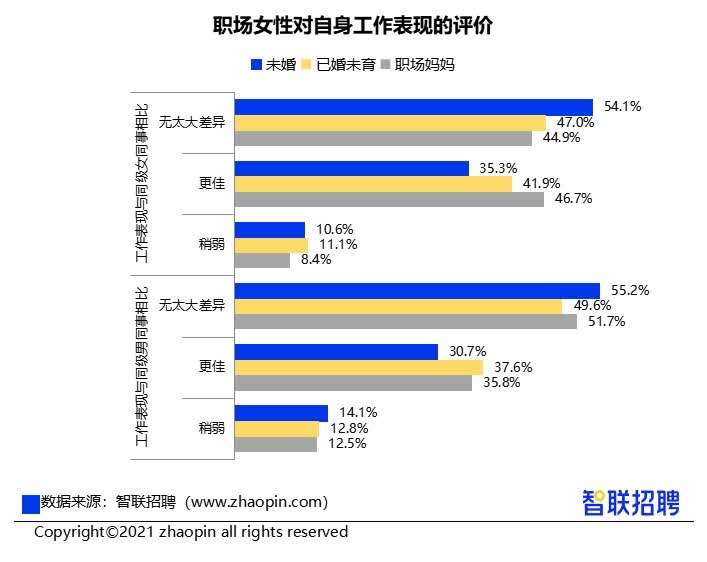 中国青年报客户端北京5月9日电(中青报·中青网记者 王聪聪)在母亲节到来之际发布的《2021年职场妈妈生存状况调查报告》显示,职场妈妈对自身工作表现更具信心。职场妈妈认为自己工作表现较同级女性同事更佳的占比为46.7%,高于已婚未育女性(41.9%)与未婚女性(35.3%)。