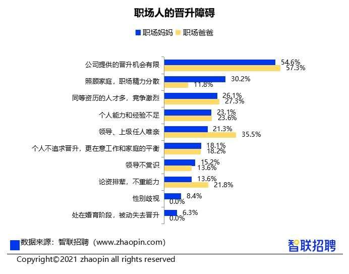 针对已婚已育职场人的晋升障碍,“公司提供的晋升机会有限”均为男女最高票选项。此外,职场妈妈因“照顾家庭,职场经历分散”而难获升职的占比超三成,职场爸爸选择该选项的仅为11.8%。而男性更倾向将职业发展的瓶颈归因于“领导、上级任人唯亲(35.5%)”“论资排辈,不重能力(21.8%)”等职场外因上。