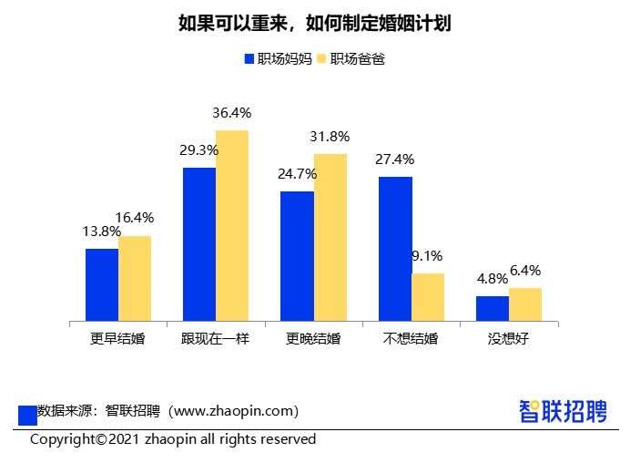职场爸爸对自己的结婚计划感到满意,36.4%都表示如果重来还会坚持自己的选择,这一数字对职场妈妈来说为29.3%。与其占比接近的则是“不想结婚”选项,为27.4%,是职场爸爸占比的三倍。另外,与职场妈妈相比,职场爸爸们只是在调整结婚时间的占比上更高,并非排斥婚姻本身。