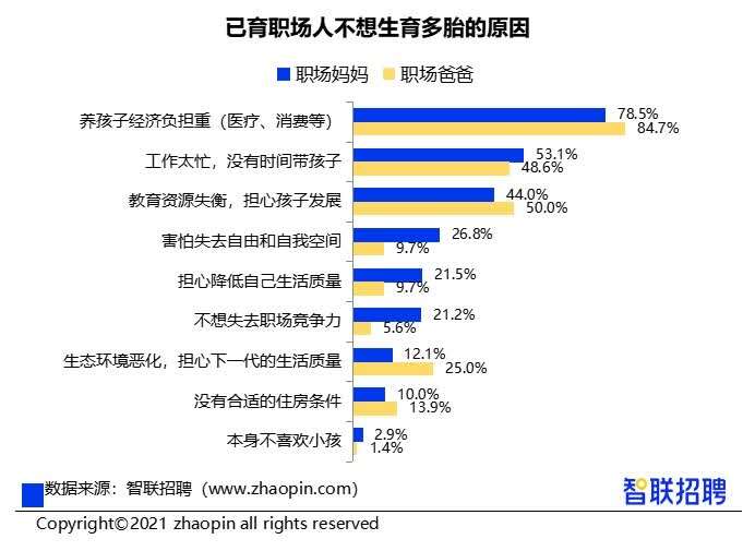 从原因来看,养娃的经济负担过重是职场妈妈和职场爸爸的首要顾虑,分别占比78.5%、84.7%。除此之外,职场妈妈更多困扰的是事业、家庭与自我的平衡,选择“工作太忙,没有时间带孩子”“害怕失去自由和自我空间”“担心降低自己生活质量”“不想失去职场竞争力”等原因的比例明显高于职场爸爸;而职场爸爸则更多考虑经济、教育、生活环境等资源问题,选择“教育资源失衡,担心孩子发展”“生态环境恶化,担心下一代的生活质量”“没有合适的住房条件”等原因的比例则均高于职场妈妈。