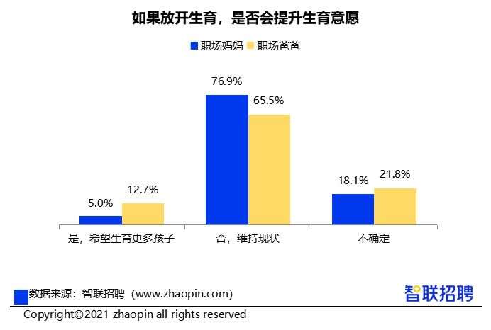 76.9%的职场妈妈和65.5%的职场爸爸表示不会选择再次生育。12.7%的职场爸爸对生育更多孩子持乐观支持态度,而给予肯定答案的职场妈妈仅占5%。
