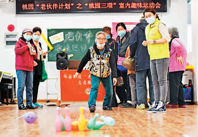 4月2日,在天津市河西区桃园街道居家养老服务中心二楼,一场别开生面的中老年人健康趣味运动会正在举行。来自社区的部分中老年人参加了保龄球、套圈、射箭等趣味项目活动。 史嵩摄(人民视觉)