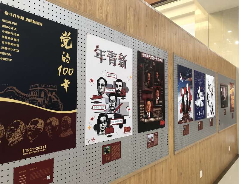 而在华东理工大学奉贤校区图书馆一楼大厅,一组名为“建党100周年主题设计创意呈现”的主题展览正在进行。这组动态海报,是华理艺术学院工设190班的“创意呈现”课程作业。
