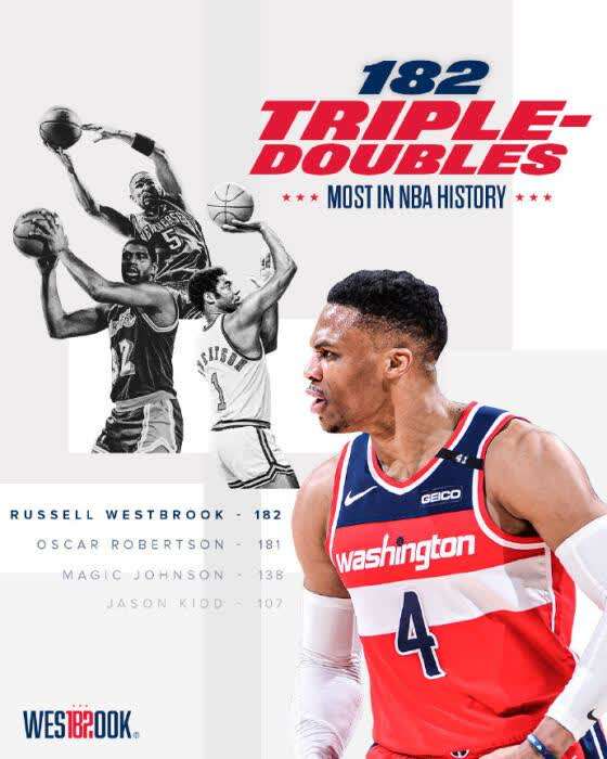这是维斯布鲁克本赛季第36次三双,刷新奇才队史纪录。同时这也是他生涯第3次单赛季至少得到30次三双,NBA历史首人。
