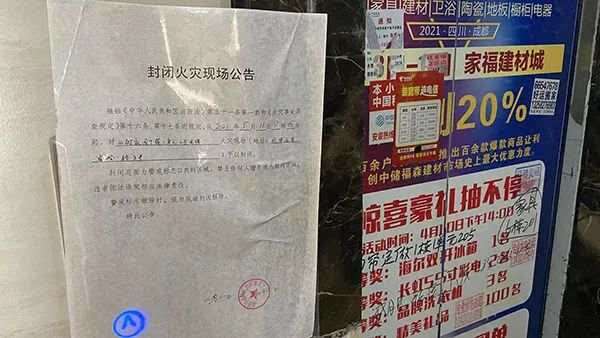 事发的丛树家园小区位于成都市成华区三环路内侧,是当地的安置回迁小区,小区住户大多还在进行装修。5月11日,澎湃新闻在事发小区9栋1单元看到,10日傍晚发生火灾的电梯已经被成华区消防救援大队予以封闭。小区物管方也在小区的布告栏内贴出了禁止电动车上楼的通告,要求住户“务必不要将电动自行车入户停放,不能在家充电”。