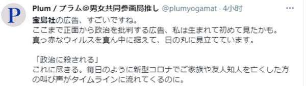 “宝岛社的广告,真厉害啊。有生之来我还是第一次看到如此正面批判政府的广告。中间的红色新冠病毒看起来像是日本国旗。‘被政府杀死’,真如同广告所说。每天都能收到(其他网友发出的)因新冠病毒而丧生的亲朋好友的消息。”