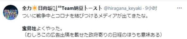 “把新冠疫情和战时联系起来的媒体终于出现了。宝岛社干得好(不如说刊载了这个广告的偏向政府的《日本经济新闻》有意思)”