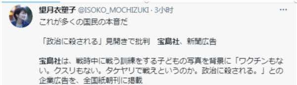 简介为日本记者、名为“望月衣塑子”的推特网友转发了报道该广告的新闻,并评论称“这是众多国民的心声”,并得到1000多名网友转发和3000多人点赞。↓