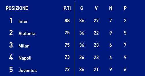 积分榜上,亚特兰大、AC米兰、那不勒斯、尤文图斯分列2至5位,相互之间分差不大。由于在相互战绩上对比尤文图斯占优,因此接下来AC米兰仅需再获得一场胜利,就可以锁定下赛季欧冠资格。