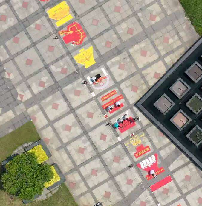 构思、构图、配比、描图、修整、上色……创意设计学院的同学们在老师的指导下,将专业上的所学,运用到实践中,从嘉兴南湖的红船到新中国的曙光、从抗美援朝的保家卫国到两弹一星的成功发射、从改革开放的春天到北京奥运的盛夏、从党的十八大到脱贫攻坚战的全面胜利,40幅各具特色的地面彩绘连成了百米党史学习教育路线。