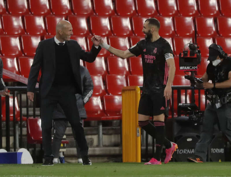 皇家马德里队主教练齐达内(左)与球员本泽马庆祝进球。新华社发