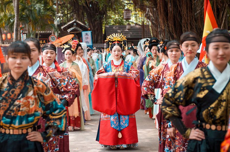 2021年5月3日,五一期间,300多位年轻人身着汉服组成方阵在深圳锦绣中华民俗村环景区巡游,200多米长的国风队伍,穿梭在青砖灰瓦,古色古香的亭台楼阁中,吸引了上千名游客围观拍照。