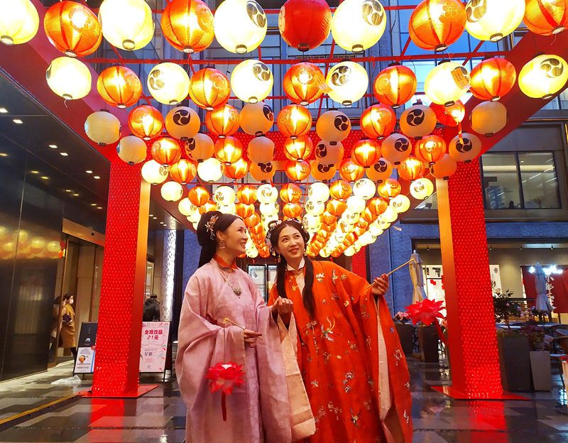 2021年2月26日, 上海,当晚是农历元宵节之夜,BFC外滩枫径格外热闹,在“元宵汉服走街”展演中,由古装小姐姐们组成汉服巡游方阵,手提荷花灯笼在商场里巡游,向市民顾客展现具有悠久历史的中华传统服饰文化之美。