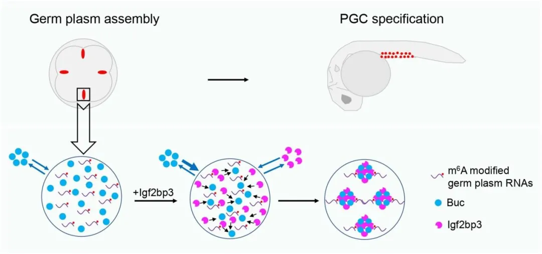 该研究揭示了Igf2bp3作为Buc的直接效应蛋白,介导m6A修饰依赖的生殖质相关mRNA的基因表达调控,并维持正常的生殖质组装(见上图)。该工作阐述了m6A修饰在鱼类生殖质组装过程中的作用,为鱼类生殖发育研究提供了参考。