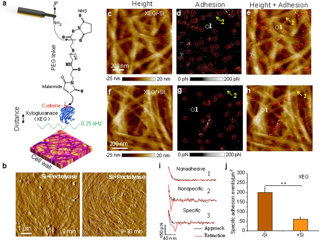 ▲原位原子力显微镜(AFM)定量纳米力学(PF-QNM)成像细胞壁。(a) PEG交联剂通过连接半胱氨酸将木葡聚糖酶(XEG)修饰到AFM针尖上。(b)减硅细胞壁用果胶酶反应30分钟前后的原子力形貌图。去果胶后的(c-e)减硅和(f-h)加硅细胞壁的(c, f )高度图,(d, g)粘附力图和(e, h)它们的合并图像。(i) 典型的无粘附力、非专一性和专一性结合的力-距离曲线。(j) 加硅细胞壁上XEG 的结合位点显著比减硅细胞少。