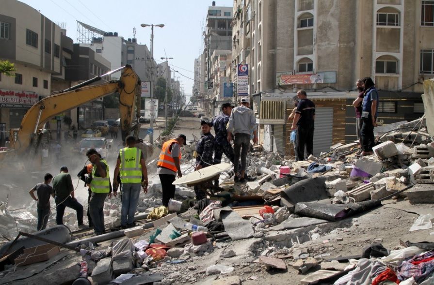 5月16日,巴勒斯坦民防人员在加沙城被炸住宅楼的废墟中进行搜救。 新华社 图