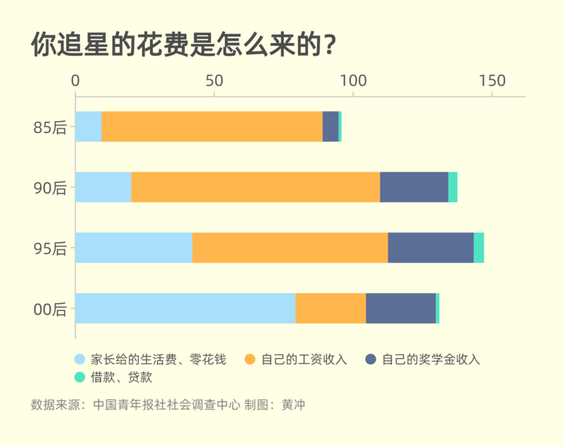 上海大四学生李欣欣回忆,读中学时每个月会花两三百元,现在每月要五六百。有特殊情况会更多。花费来源主要还是父母给的生活费,还有一些兼职收入。这些钱,以前用来买杂志、买专辑、买代言,现在更多用来做数据、电子刊,还有线下见面的花费,有时候还需要出图,发一些照片和视频。