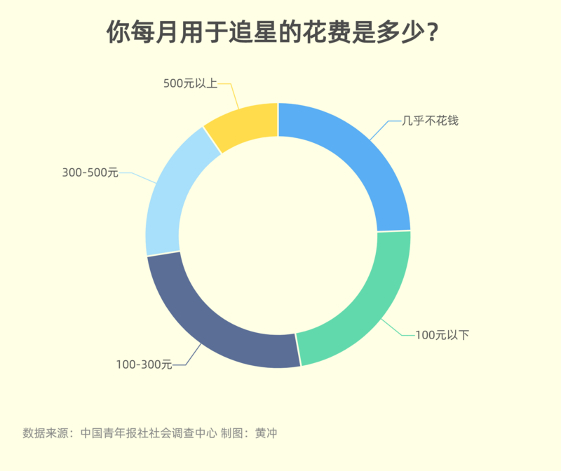 有多少青少年会在追星上花钱?近日,中国青年报社社会调查中心通过问卷网(wenjuan.com),对1616名14-35岁青少年进行的追星专项调查显示,52.8%的受访青少年每月用于追星的花费在100元以上。仅20.7%的受访青少年表示父母对此了解并支持, 50.5%的受访青少年坦言,父母并不清楚自己在为追星花钱。