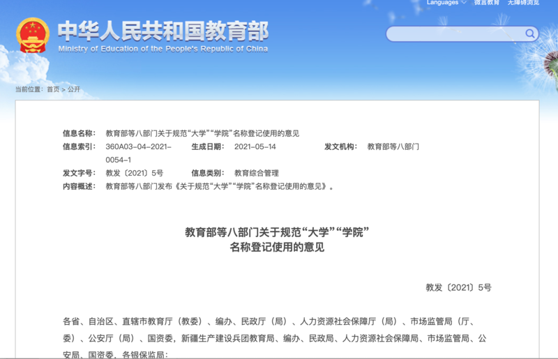 八部门强调,经审批设立的大学、学院,以及由其发起并依法设立的其他法人组织,在机构编制、民政、市场监管部门登记时可以对应使用“大学”“学院”字样。其他组织机构在登记时不得使用“大学”“学院”字样。