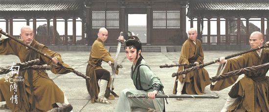 曾小敏:当时大家都很纠结,一方面觉得“踢枪”不合适,另一方面也担心没了“踢枪”,找不到更好的表现手段。导演也怕我接受不了,小心翼翼地来问我:你觉得能不能把“踢枪”拿掉?我说:只要有更好的替代方案,我可以接受。后来大家就想出了一个全新的呈现,让18个和尚拿着棍子跟白蛇对打。在电影语言的渲染之下,这18个和尚会带来一种极大的压迫感,对比之下白蛇就显得更加单薄和柔弱。而且我当时的表演也是采用了长水袖,一柔一刚,更能凸显那种弱势对强势的抗争情绪。