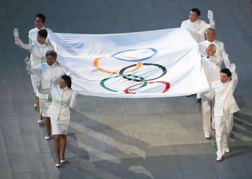 2008年8月8日,中国首位珠峰北坡登顶的女登山家潘多(左边从前数第二位)在北京奥运会开幕式上,手执奥林匹克会旗入场。新华社发