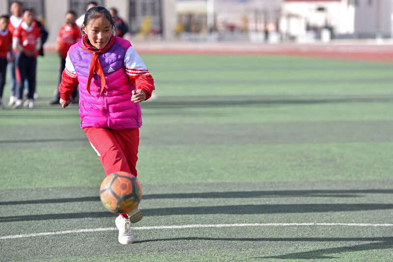 藏族姑娘多吉卓玛在当雄县龙仁乡小学参加学校的足球兴趣课。新华社记者孙瑞博摄
