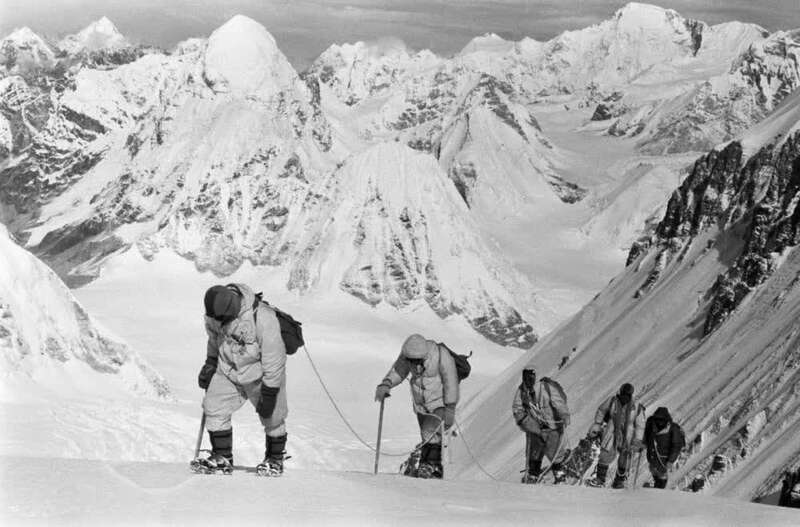 照片拍摄于1960年5月,中国登山队队员在海拔7150米的冰雪坡上行进。新华社发
