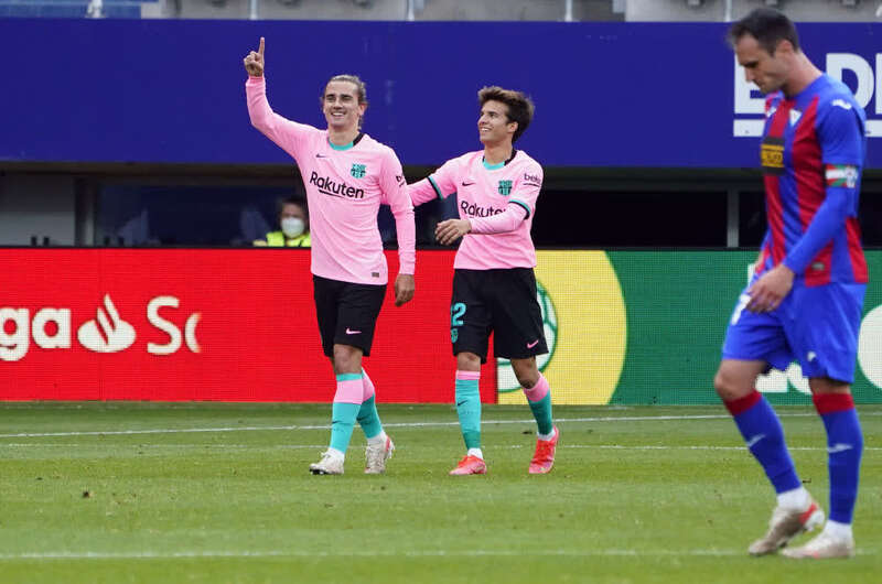 巴塞罗那队球员格列兹曼(左)在比赛中庆祝进球。新华社/路透
