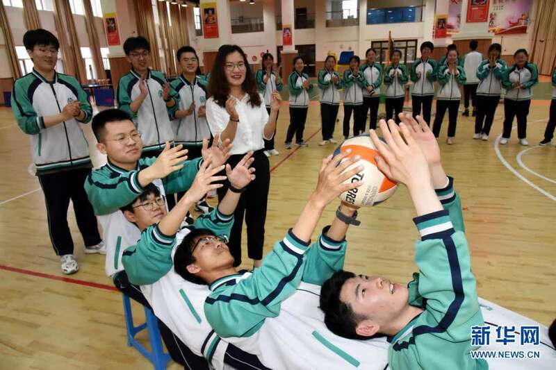 5月23日,青岛通济实验学校高三学生在进行“躺椅传球”游戏。