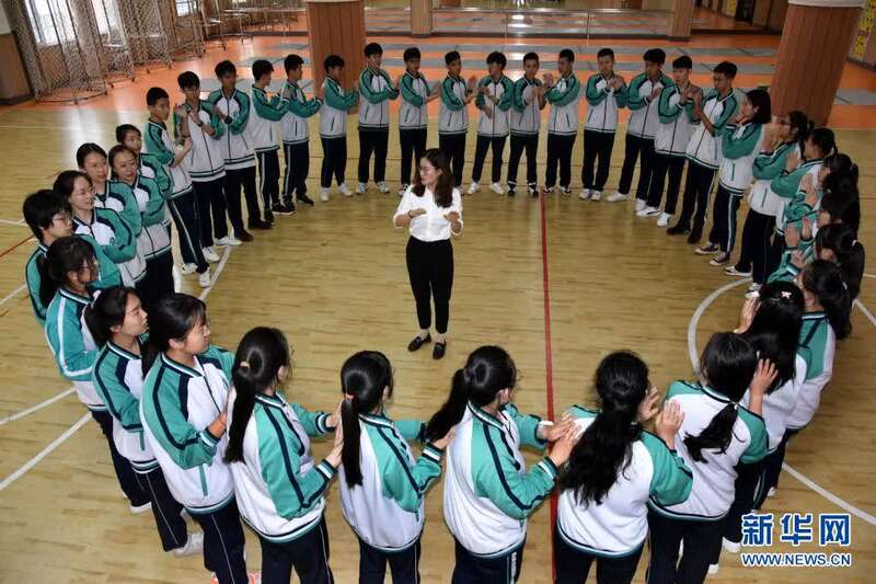 5月23日,在青岛通济实验学校,高三学生在老师的带领下一起做减压操。