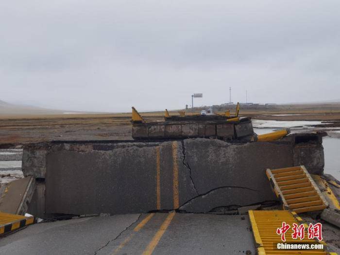 5月22日2时4分,青海省果洛藏族自治州玛多县发生7.4级地震,震源深度17千米。图为震后花久线(花石峡至久治)的昌马河大桥坍塌,桥面断成数截。中新社记者 李赟 摄