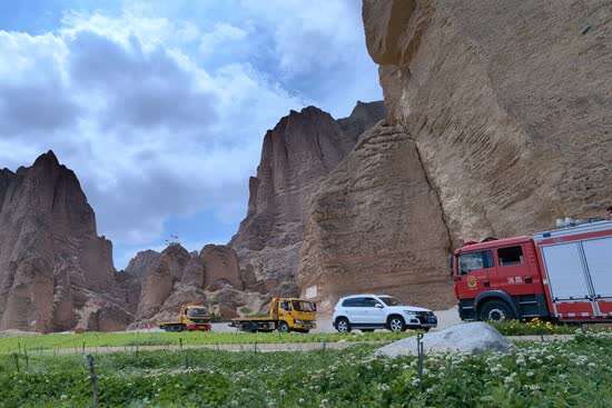 2021年5月23日,景泰县黄河石林景区内的救援车辆。视觉中国供图