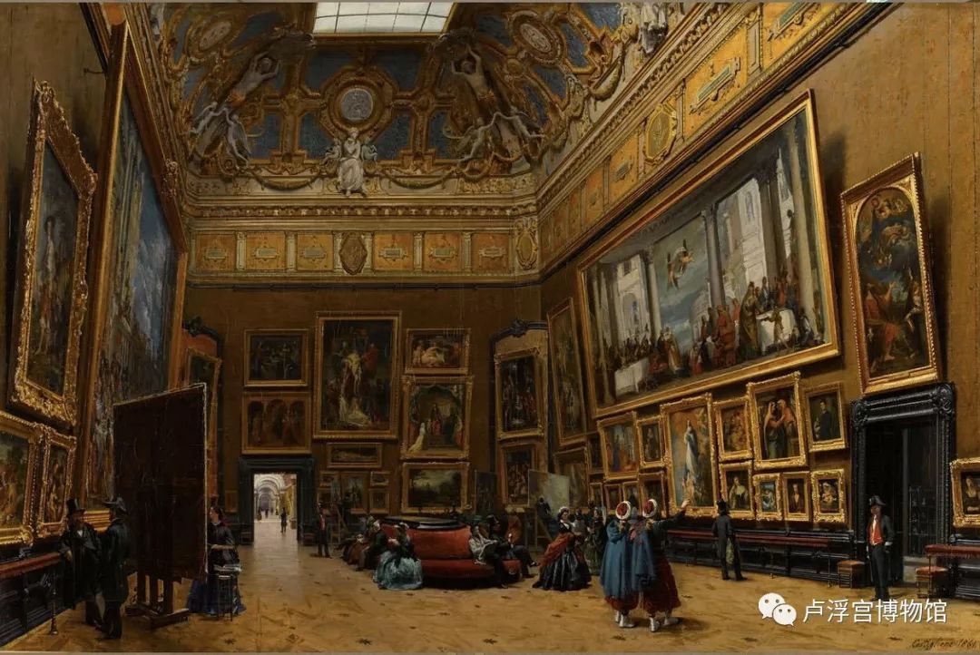 朱塞佩在《卢浮宫方形沙龙厅》这幅画中展示的是卢浮宫的方形休息室视角。1861年,沙龙迎接了近10年各个时代和画家的杰作。