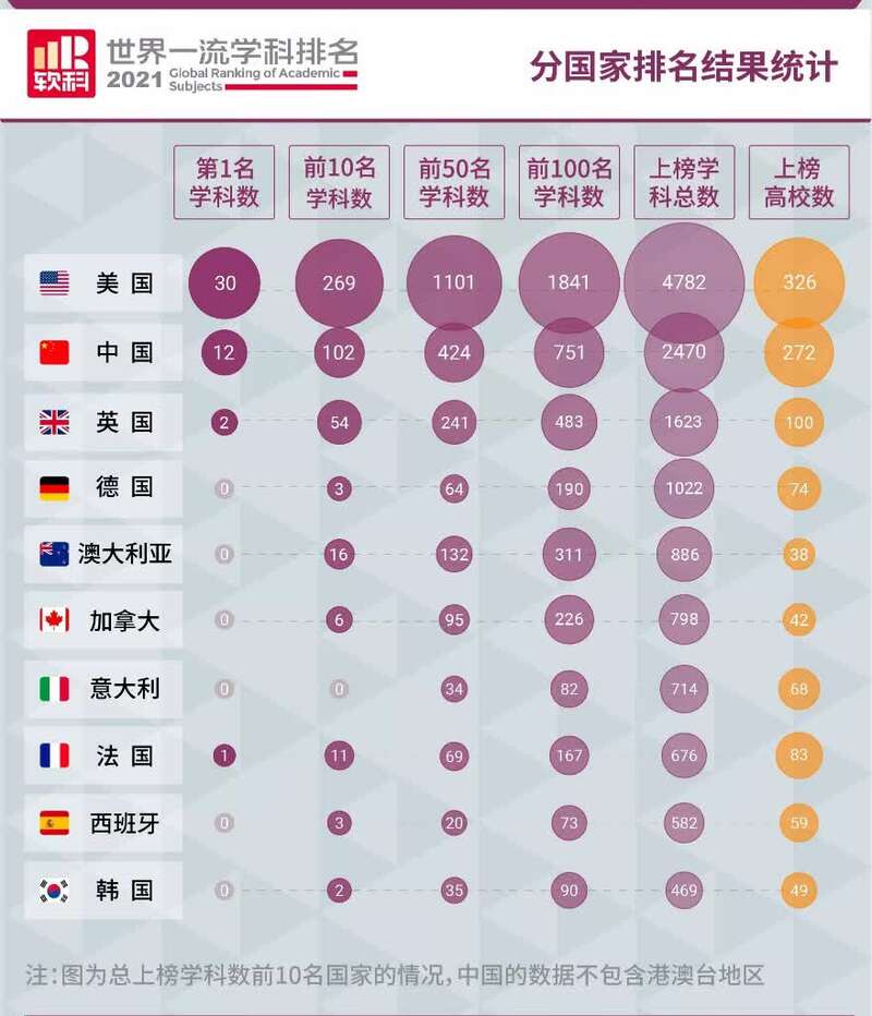 据悉,此次排名的对象为全球4000余所大学,共有来自93个国家和地区的1800余所高校最终出现在各个学科的榜单上。美国大学在30个学科中夺冠,上榜总次数达到4782次。中国内地共有272所高校上榜,上榜总次数2470次,仅次于美国,位列全球第二。与去年相比,中国内地此次上榜高校数量和上榜总次数分别增加了7.5%和11.3%,均有显著提升。